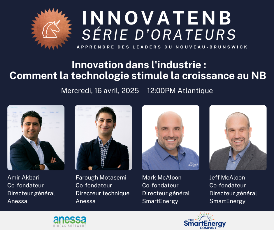 Anessa, une compagnie de logiciels spécialisée dans les solutions innovantes pour l'industrie du biogaz, partagera la façon dont elle utilise l'analyse prédictive pour simuler les performances futures des usines de biogaz. Anessa a reçu le prix du Produit ou service le plus innovant décerné par InnovateNB.